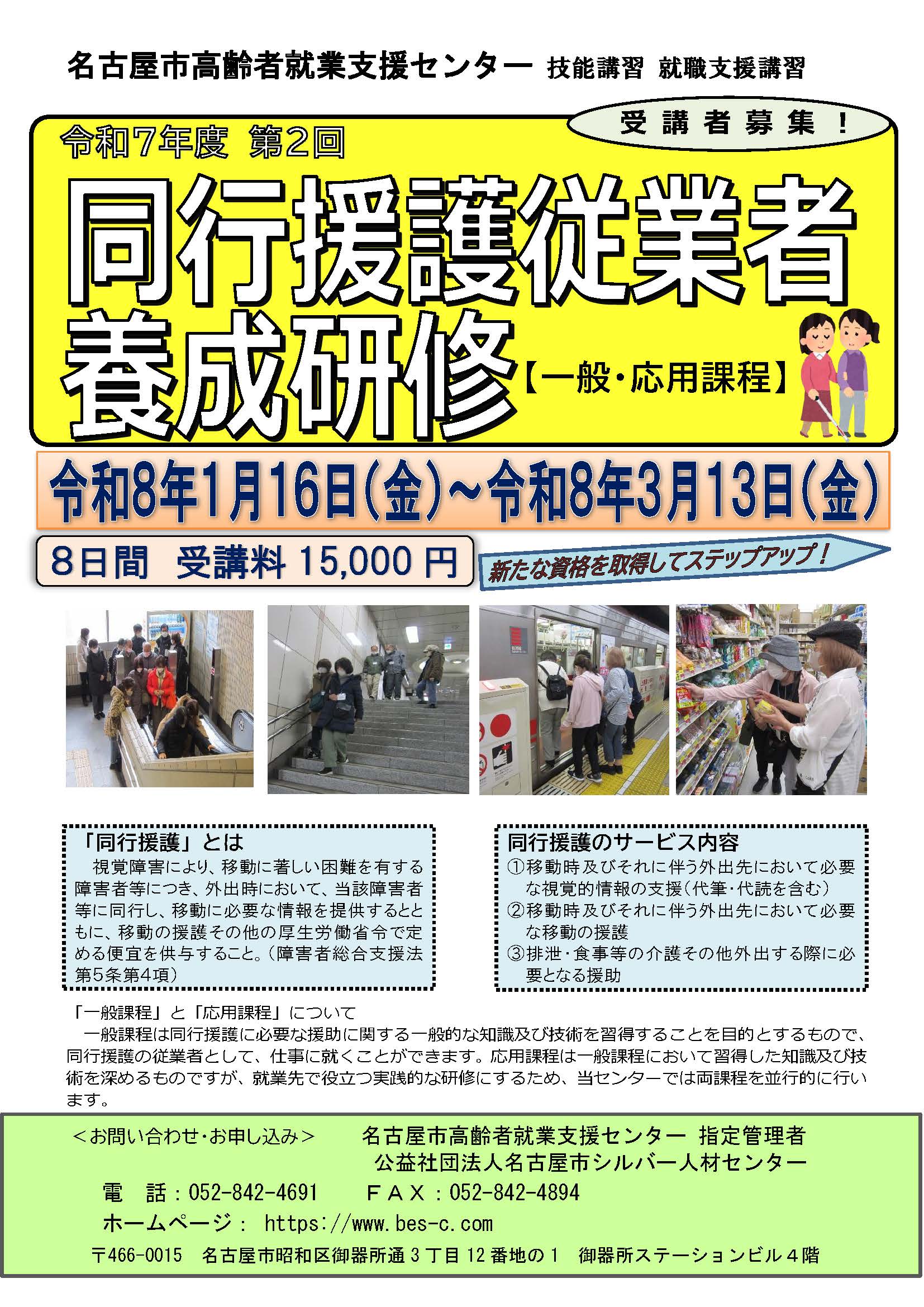 視覚障害者等の外出支援の知識・技術を身に付け、就職に役立てます。修了認定者には、同行援護従業者養成研修一般・応用課程の修了証明書を交付します。最終日にはシニア就職フェアを行います。